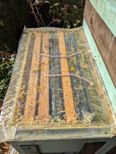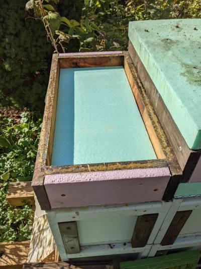 There is R20 roof insulation on every 6 frame hive. Right picture shows that vents in ventilation box are closed with 3/4“ XPS