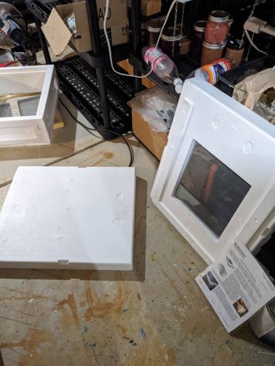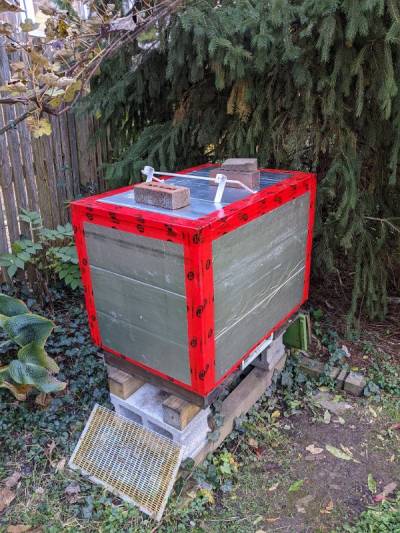 There are two pieces of R10 XPS on the top of poly cover to make total ~R26. The roof is much better insulated then the side walls. The red tape closes air leaks between lower and upper box. There is no upper entrance/ventilation. All ventilation is through lower narrow entrance and open screened bottom.
