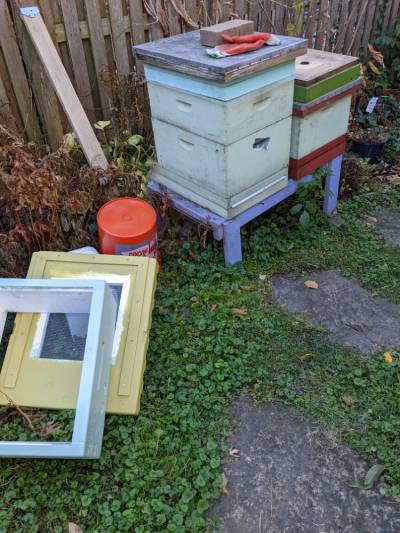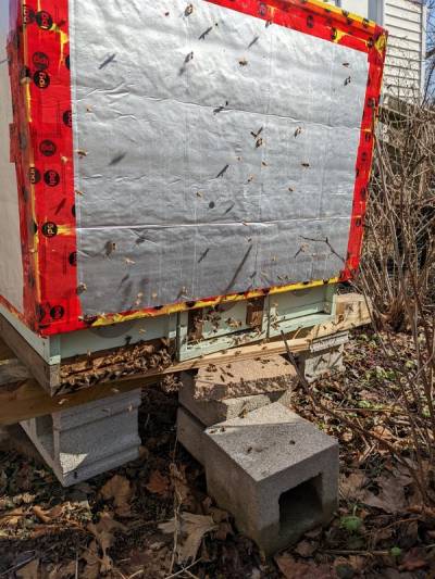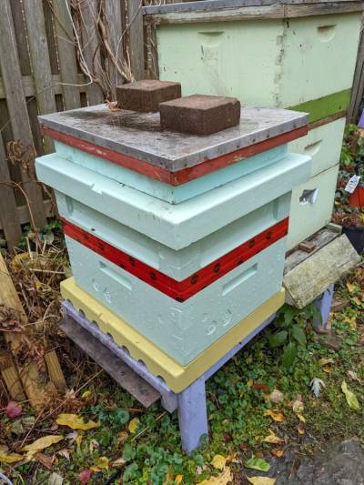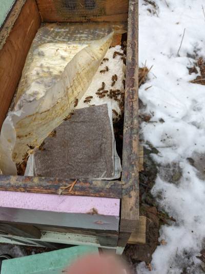 A single hood covers three colonies. Each colony is made of two 6 frame deep boxes. Upper box was full of food (~40lb) going into winter. In March each colony got a sugar brick and a pollen substitute patty.