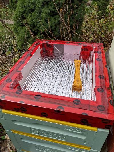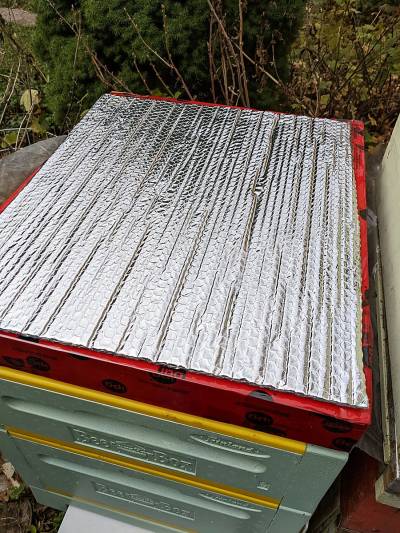Clear foil, so one can see bees without letting them out. Rope pieces give enough space between the foil and top bars for bees to cross over.